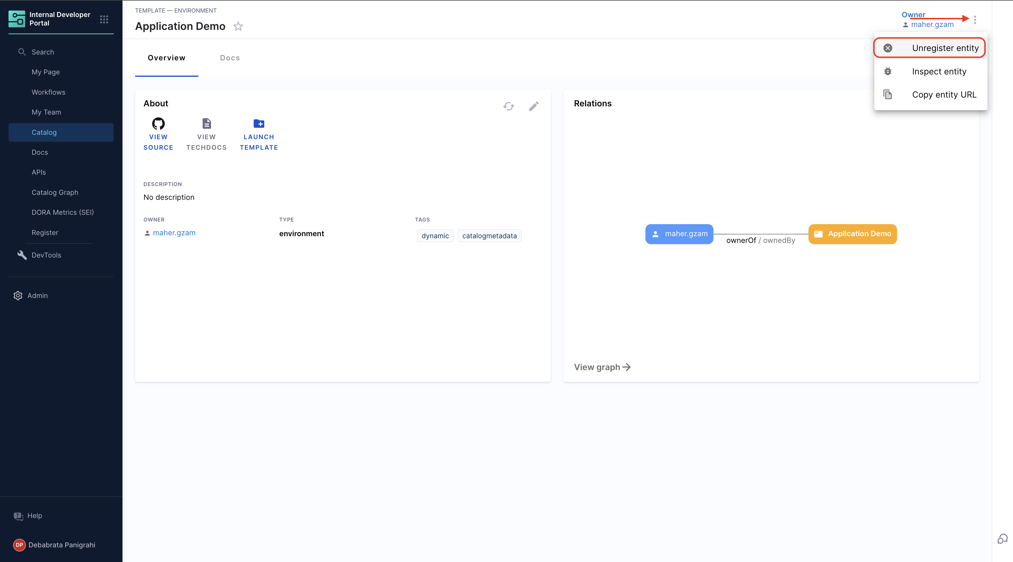 You can also inspect the catalog metadata for a workflow by clicking on the three dots in the top-right corner and selecting “Inspect Entity”.