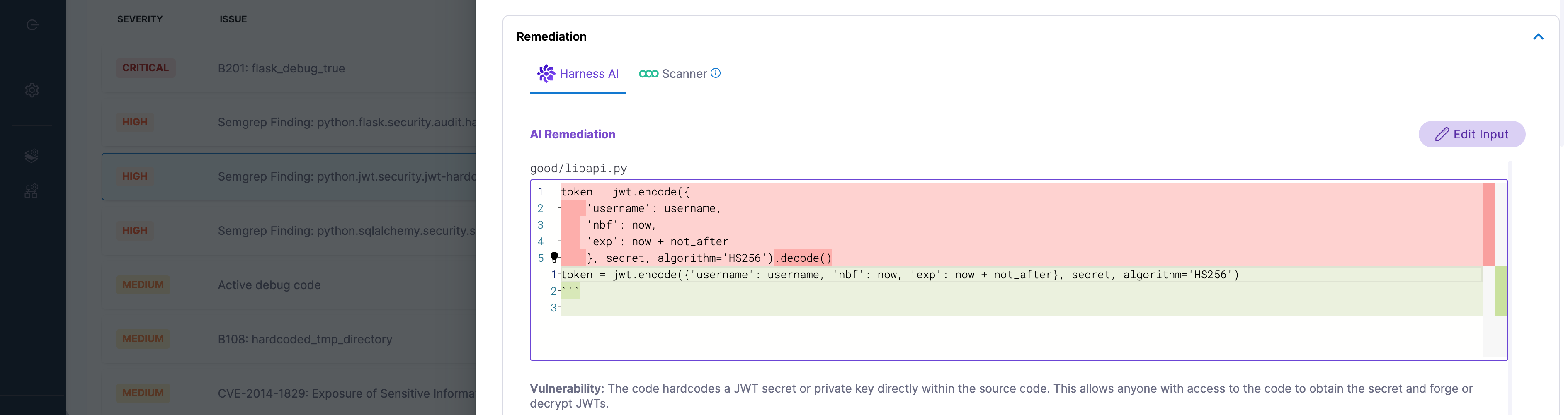 • Remediation: Steps from Harness AI and Scanner (see Fix security issues using Harness AI).