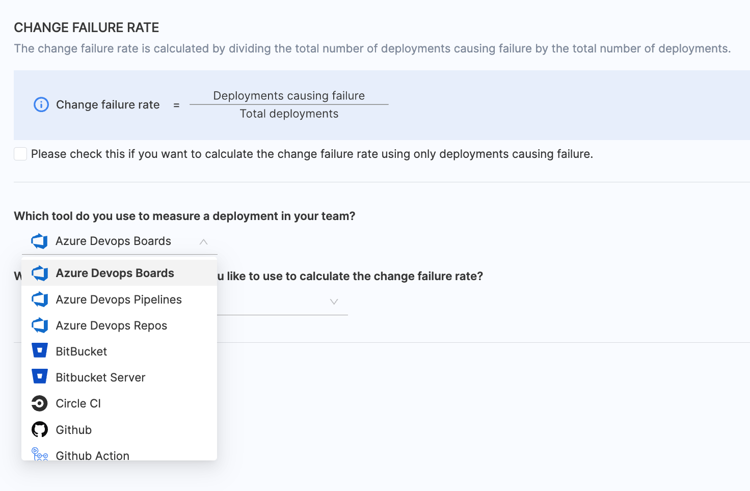 - Choose BitBucket / BitBucker Server as the tool that you use to measure change failure rate in your team.