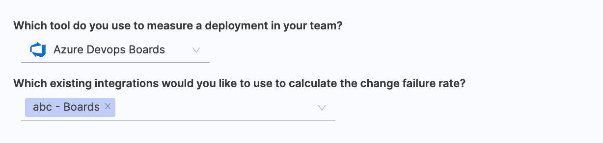 - Select the relevant Azure Boards integrations that you wish to use for calculating change failure rate.