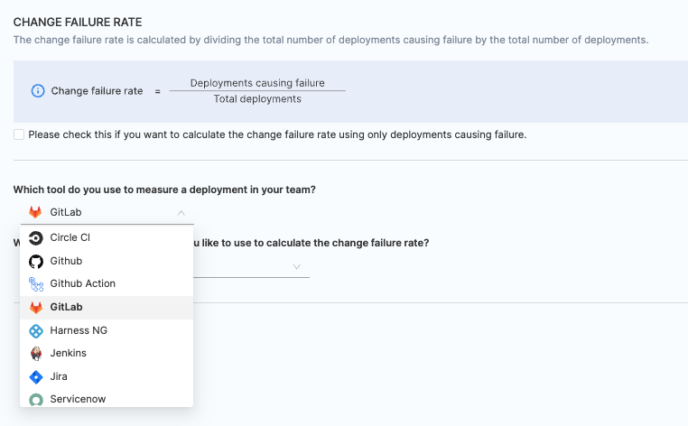 When the integration is configured with GitLab SCM, specify whether deployments causing failure and total deployments are defined based on Pull Requests (PR) or Commits.